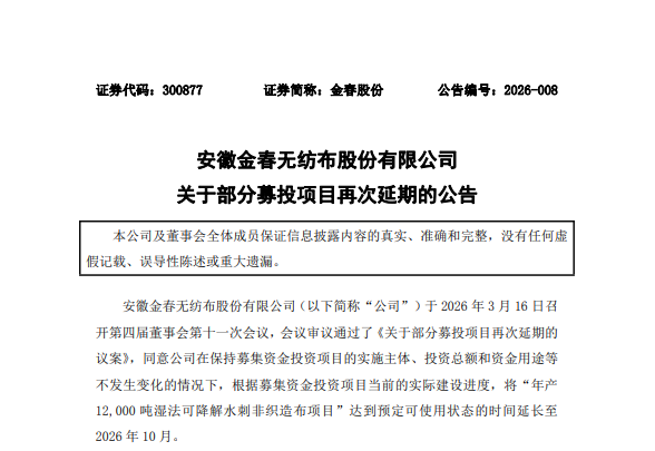 3月16日,金春股份(300877)披露,其“年产12000吨湿法可降解水刺非织造布项目”(下称湿法水刺项目)将再次延期8个月至2026年10月。据悉,其在经历首次延期后,投资进度仍未过半。