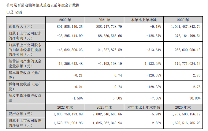 然而好景不长。随着疫情防控常态化及行业产能的集中释放,市场迅速进入调整期。2021年,公司营业收入下滑至8.89亿元,净利润骤降至8855万元,同比降幅达67.94%。2022年更是出现上市以来的首次亏损,当年归属于上市公司股东的净利润为-2529.54万元,扣非后净利润亏损达4562.28万元。