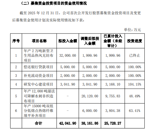 这已是该项目的第二次延期。根据公告,湿法水刺项目最初计划的投产日期为2025年2月,后被调整至2026年2月,如今再度推迟8个月。根据金春股份披露的募集资金使用情况,截至2025年12月31日,对拟投入2.01亿元的湿法水刺项目,公司已累计投入9755.83万元,投资进度为48.49%,尚不足一半。