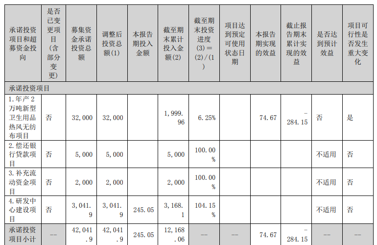 已投产项目的效益情况方面,根据公司2023年年报问询函回复及历年财报数据:“年产2.2万吨医疗卫生用复合水刺无纺布项目” 自2021年5月陆续投产,2021年至2023年实现效益分别为-846.92万元、-1317.98万元和-1083.70万元,连年亏损。2024年该项目仍亏损473.89万元;