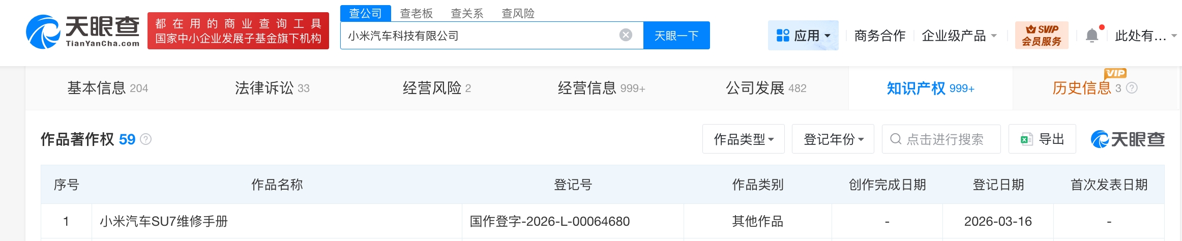 天眼查知识产权信息显示,近日,小米汽车科技有限公司登记“小米汽车SU7维修手册”作品著作权。值得一提的是,此前,该公司还登记了“小米汽车YU7用户手册”作品著作权。