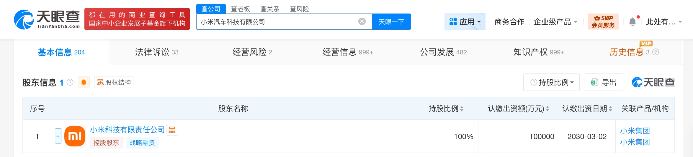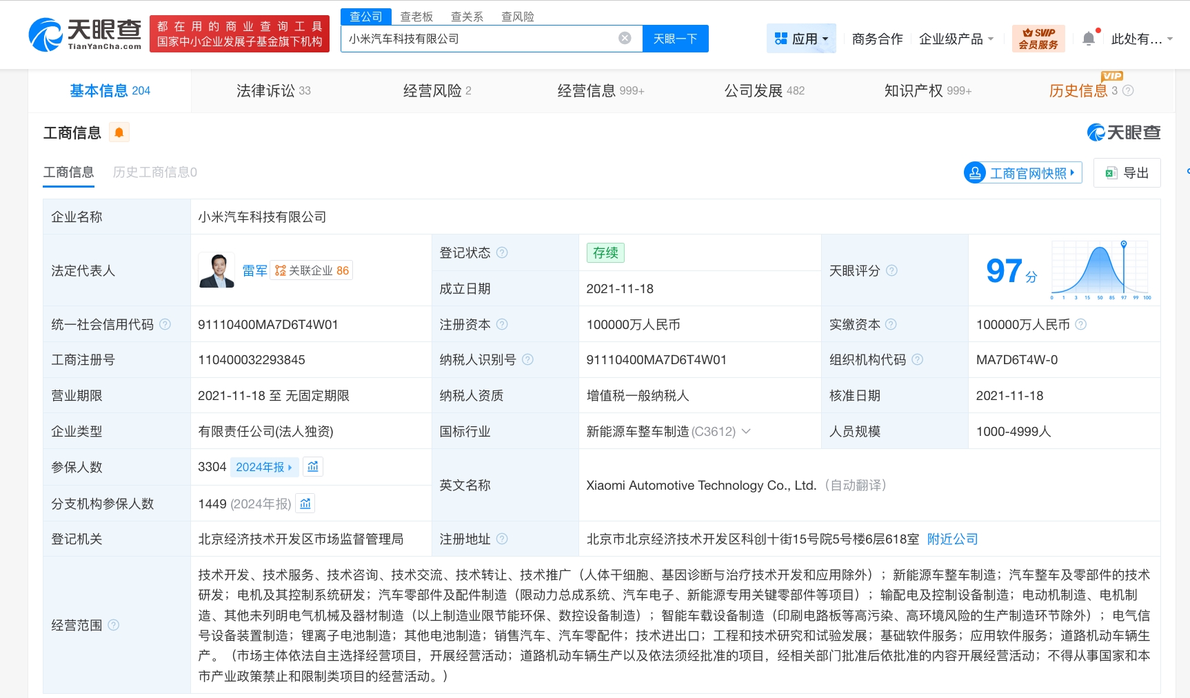 小米汽车科技有限公司成立于2021年11月,法定代表人为雷军,注册资本10亿人民币,经营范围包括新能源车整车制造、汽车整车及零部件的技术研发、智能车载设备制造等。股东信息显示,该公司由小米科技有限责任公司全资持股。