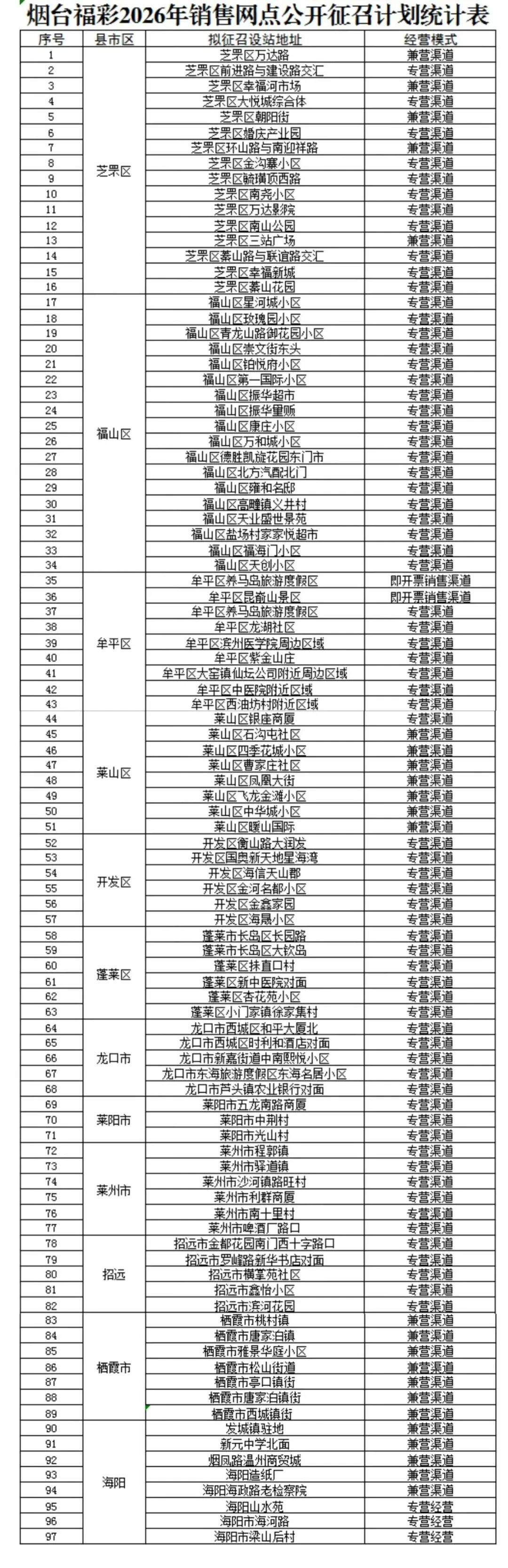 为进一步提升烟台市福利彩票事业发展质效,促进销售渠道多元化、规范化布局,持续满足广大市民便捷购彩需求,吸引更多爱心人士参与社会公益事业,拓宽就业创业渠道,烟台市福利彩票中心决定,面向全市范围内,定点公开征召97处福利彩票销售网点,重点布局空白街道、新建大型社区周边、城乡接合部、商业繁华路段及人口密集区域,具体内容公告如下: