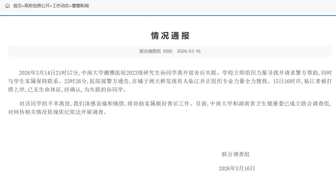 湖南省卫生健康委员会联合调查组3月16日发布情况通报:2026年3月14日21时57分,中南大学湘雅医院2023级研究生孙同学离开宿舍后失联。学校立即组织力量寻找并请求警方帮助,同时与学生家属保持联系。23时26分,医院接警方通告,在橘子洲大桥发现有人坠江并正组织专业力量全力搜救。15日16时许,坠江者被打捞上岸,已无生命体征,经确认,为失联的孙同学。