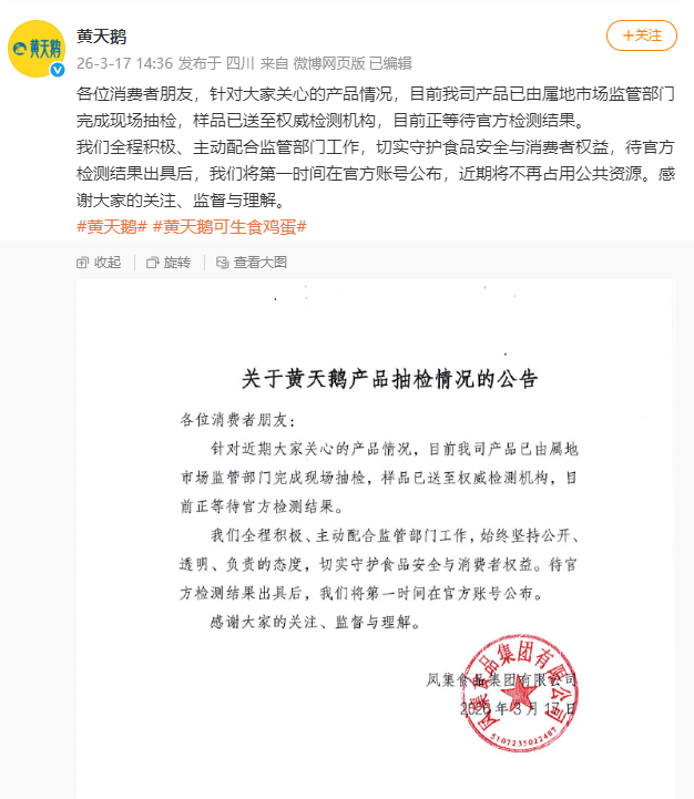 3月17日14时35分,黄天鹅微博发布“关于黄天鹅产品抽检情况的公告”称,针对大家关心的产品情况,目前公司产品已由属地市场监管部门完成现场抽检,样品已送至权威检测机构,目前正等待官方检测结果。