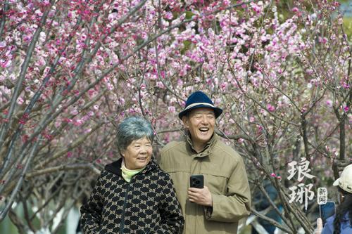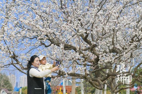 3月17日,在临沂市雕塑公园,游客在盛开的春花下赏花拍照。连日来,气温回暖、春风拂面,我市各景区、大街小巷内的梅花、杏花、迎春花、玉兰花等各种春花盛开,芳香四溢,吸引了众多市民驻足的同时也将整座城市扮靓。