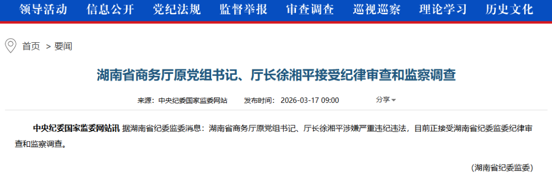 3月17日,据湖南省纪委监委消息:湖南省商务厅原党组书记、厅长徐湘平涉嫌严重违纪违法,目前正接受湖南省纪委监委纪律审查和监察调查。