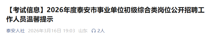 3月16日,泰安市人社局发布温馨提示,2026年度泰安市事业单位初级综合类岗位公开招聘工作人员笔试将于3月22日举行。详情如下: