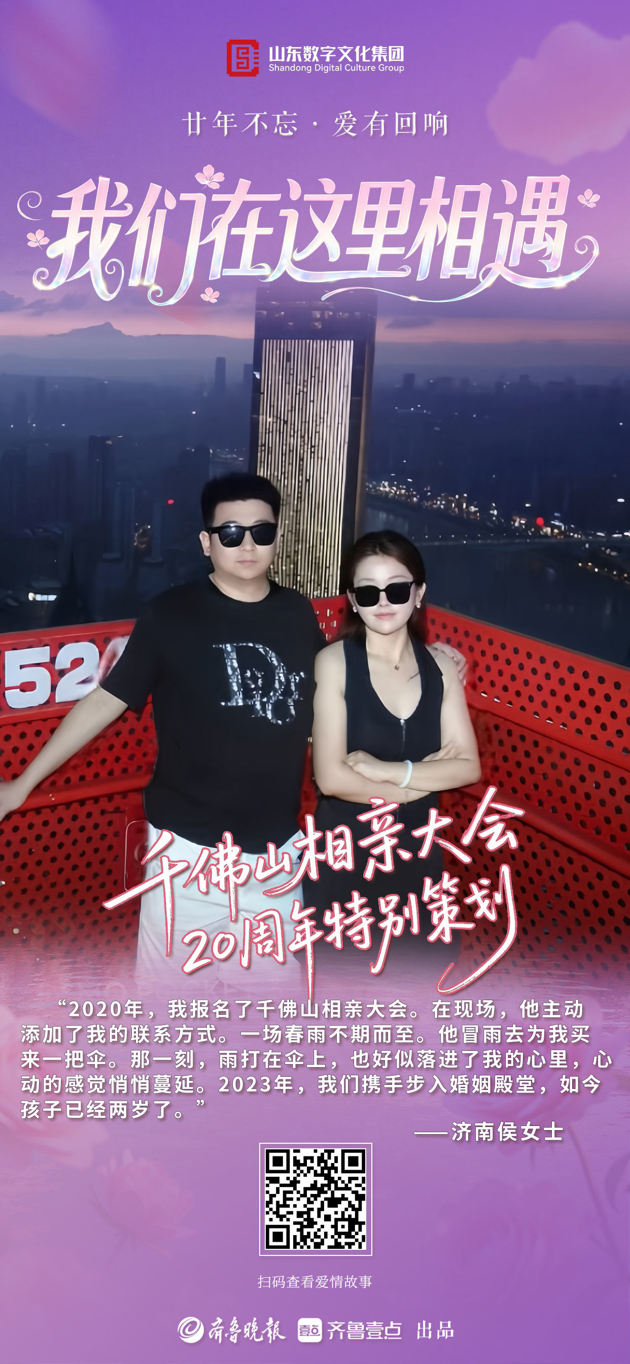 从2006到2026,二十年岁月如歌,二十年只为相遇。值此千佛山相亲大会二十周年之际,齐鲁晚报·齐鲁壹点推出“廿年不忘·爱有回响”千佛山相亲大会二十周年特别策划,向通过相亲会结缘另一半组建幸福美满家庭的无数个有缘人发出诚挚邀请,在二十周年这个特别的日子里,一起分享我们在这里相遇的故事,共忆动心时刻,共叙相守温情。