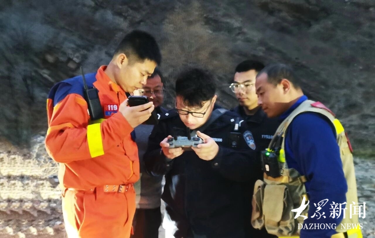 接警后,民警迅速行动,携带装备并联系消防救援人员一同展开搜救。然而,母子俩无法清晰描述自己所处的具体位置,民警只能依据他们的描述大致划定一个搜寻范围,随后启用警用无人机进行高空搜寻。
