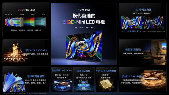 T7M Pro作为定位换代首选的SQD-Mini LED电视,实现了对同价位段产品的“跨代技术碾压”,堪称电视换代的闭眼之选。该机在主流价位段率先采用SQD-Mini LED技术,其100%BT.2020全局高色域较普通Mini LED领先一个代际。1152个万象分区的分区数量等同于RGB电视3456分区,配合绚彩XDR 2200nits亮度,在色彩、对比度与亮度上形成全面优势,实现对同级产品的技术降维打击。此外,它还升级了超级蝶翼星曜屏、安桥2.1.2Hi-Fi音响、TSR AI光色同控芯片及灵控系统3.0,确保使用体验无短板。