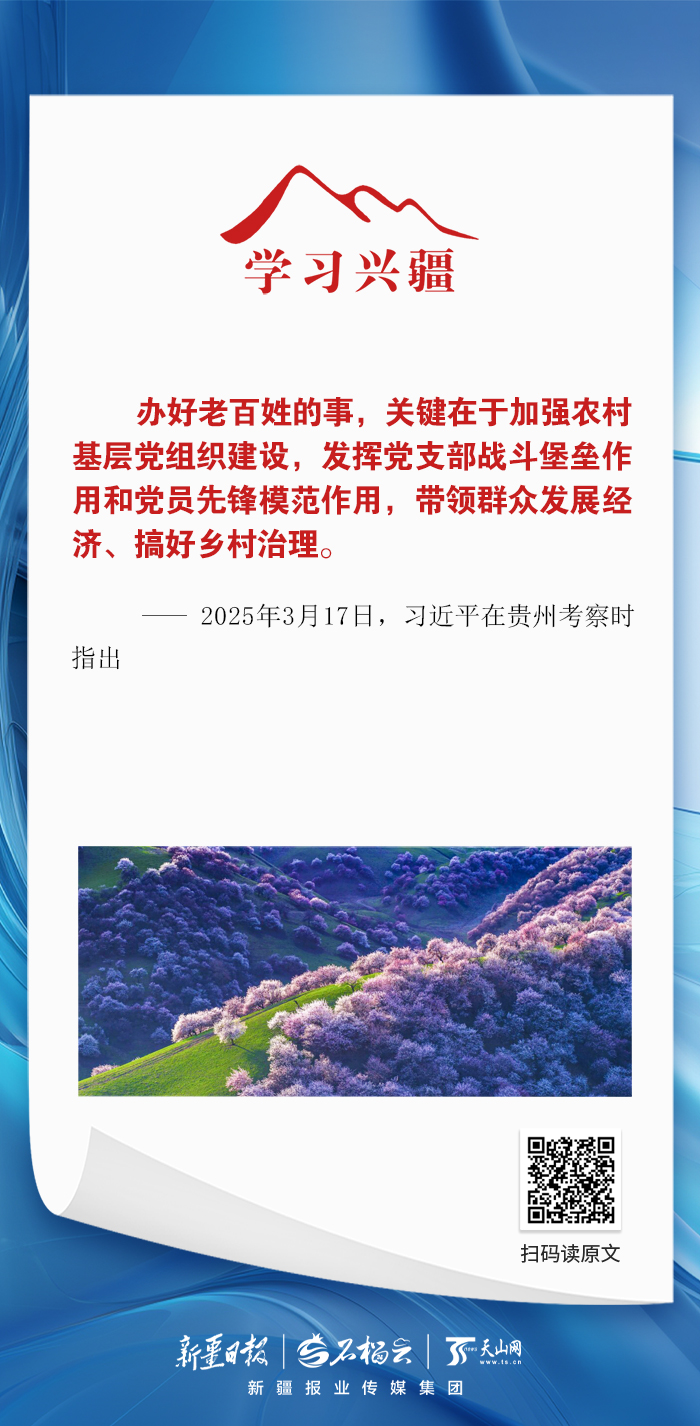 学习兴疆丨办好老百姓的事,关键在于加强农村基层党组织建设天山网 2026-03-17 17:25:48办好老百姓的事,关键在于加强农村基层党组织建设,发挥党支部战斗堡垒作用和党员先锋模范作用,带领群众发展经济、搞好乡村治理。——2025年3月17日,习近平在贵州考察时指出责任编辑:阿依提拉·图尔荪