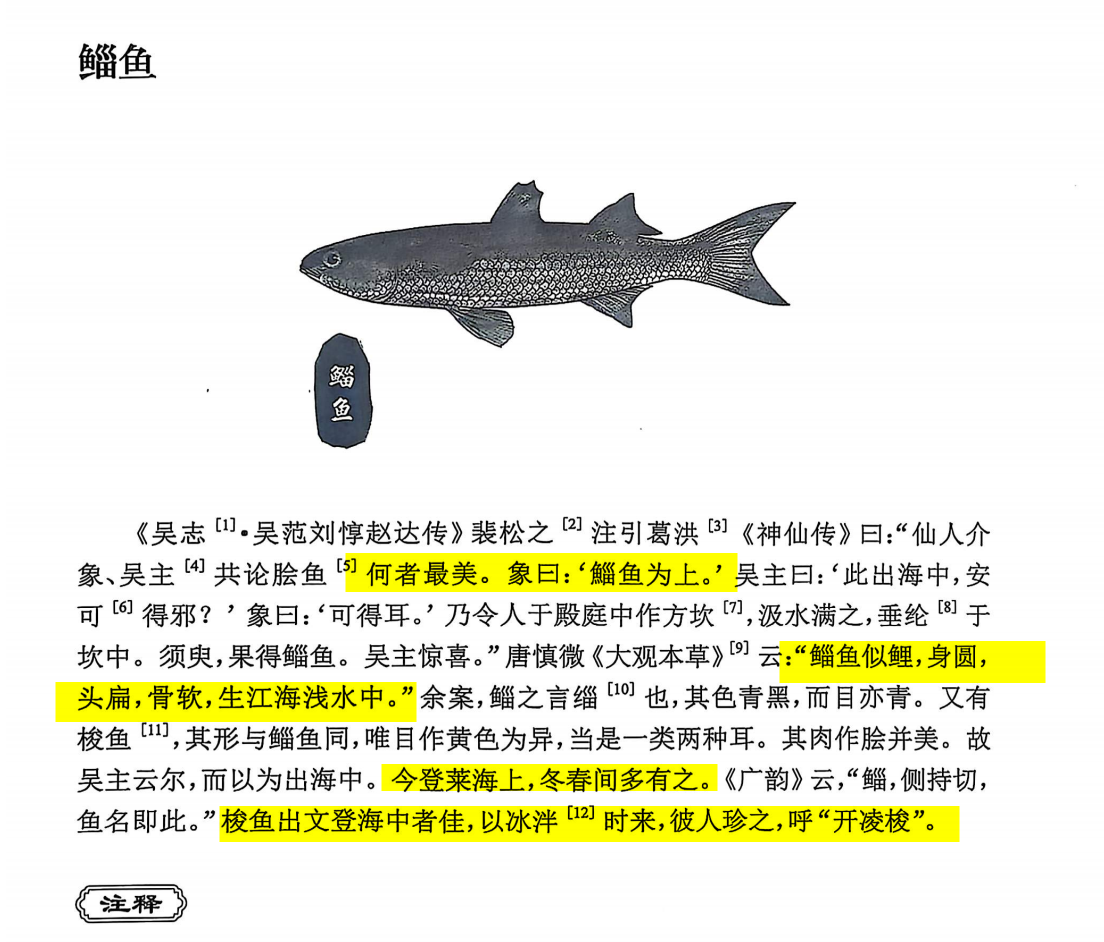 其实,早在200多年前,清代栖霞学者郝懿行的《记海错》里,就曾鲜活地描写过“开冰梭”——“其形与鲻鱼同,唯目作黄色为异,当是一类两种耳。其肉作脍并美……今登莱海上,冬春间多有之。”又言:“梭鱼出文登海中者佳,以冰泮时来,彼人珍之,呼‘开凌梭’。”