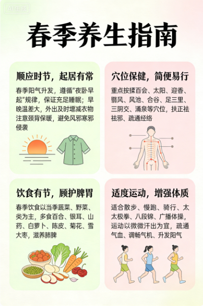 一是顺应时节,起居有常。春季阳气升发,宜夜卧早起,以保证充足睡眠,令阳气渐生、正气充盛。早晚温差较大,外出应及时增减衣物,尤其注意颈背保暖,避免风邪、寒邪直接侵袭。