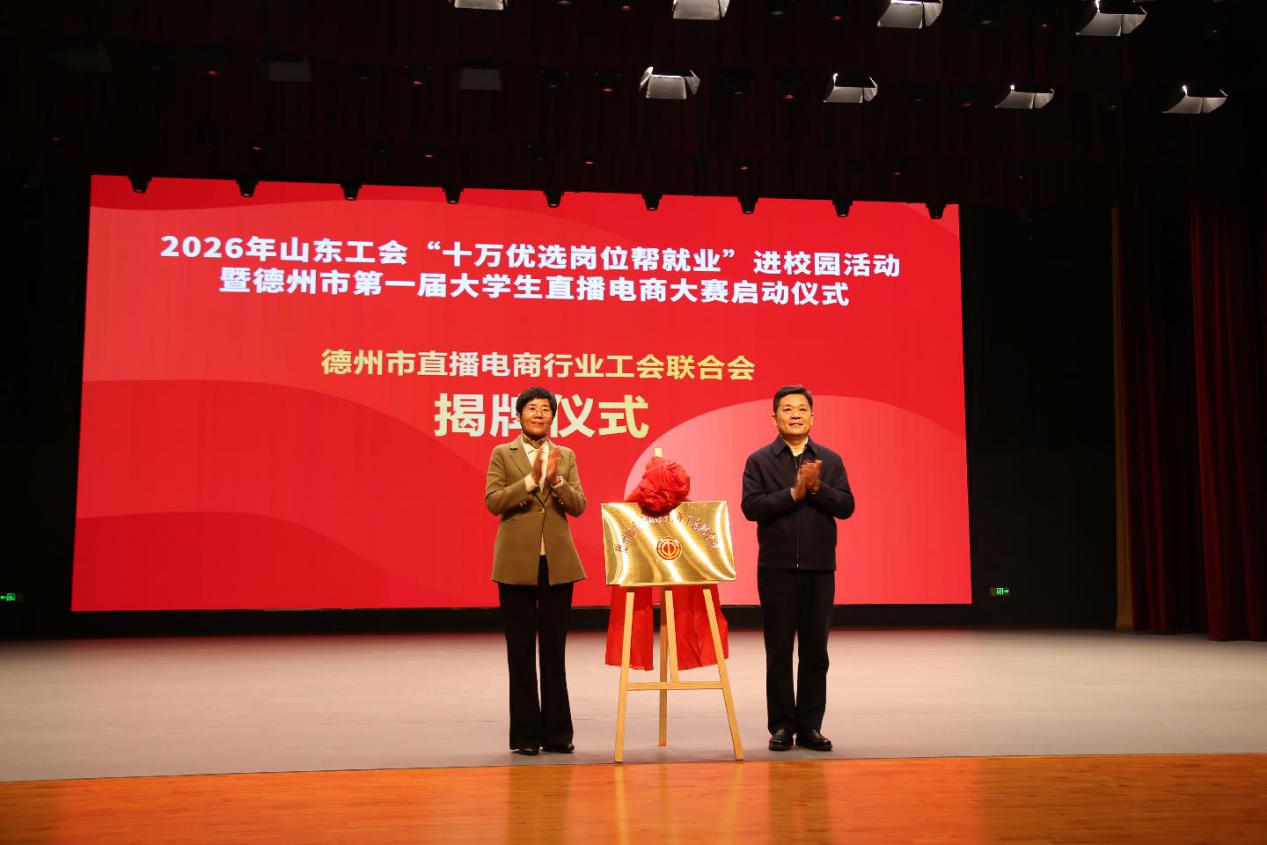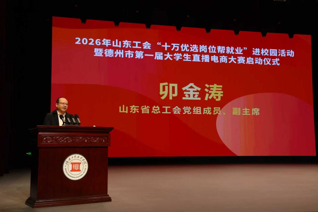 3月17日,2026年山东工会“十万优选岗位帮就业”进校园活动暨德州市第一届大学生直播电商大赛启动仪式在德州工程职业学院举行。省总工会党组成员、副主席卯金涛出席并讲话,德州市政协副主席、党组副书记,市总工会主席才玉璞,德州市总工会、市商务局、市人力资源和社会保障局、共青团德州市委、天衢新区相关负责同志出席活动。