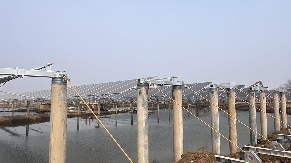 记者注意到,项目东侧已经建设完成,西侧正在紧张施工中。而就在半年前,这片雏形已现的大型“渔光互补”项目现场,还是一片杂草丛生的闲置鱼塘。