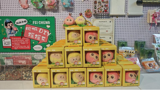 位于肥城市民中心的逸心斋文创小摊,则是肥城文化的“浓缩版潮玩站”。小摊以肥城地图为思路,深挖本地神话传说与核心景点,让每一件文创都成为“可带走的肥城名片”。如仿制春秋陈侯壶的迷你手办文化气息浓厚,白里佛桃、红里佛桃IP形象软萌可爱,吸引不少年轻人追捧购买。