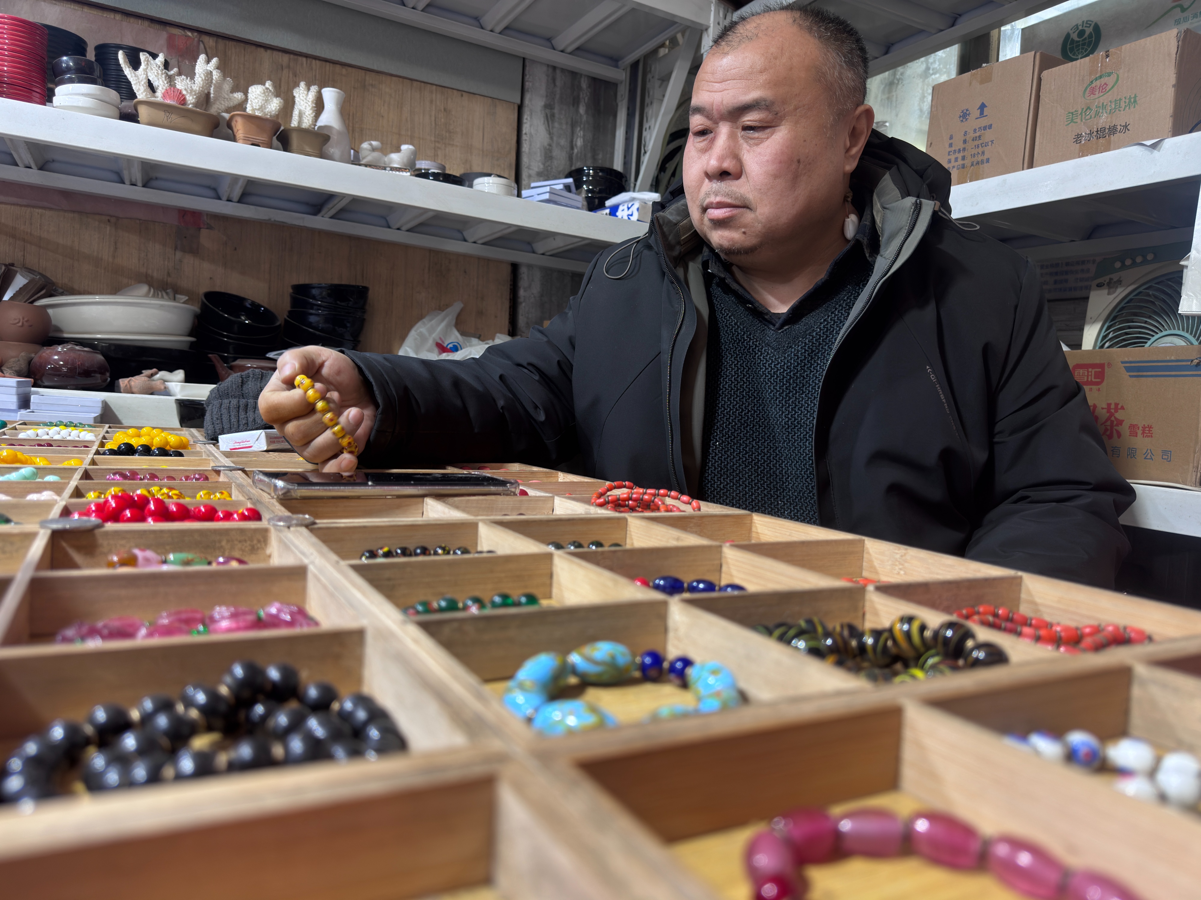 苏文博在摊位前跟记者说明红色琉璃珠的不同色彩。