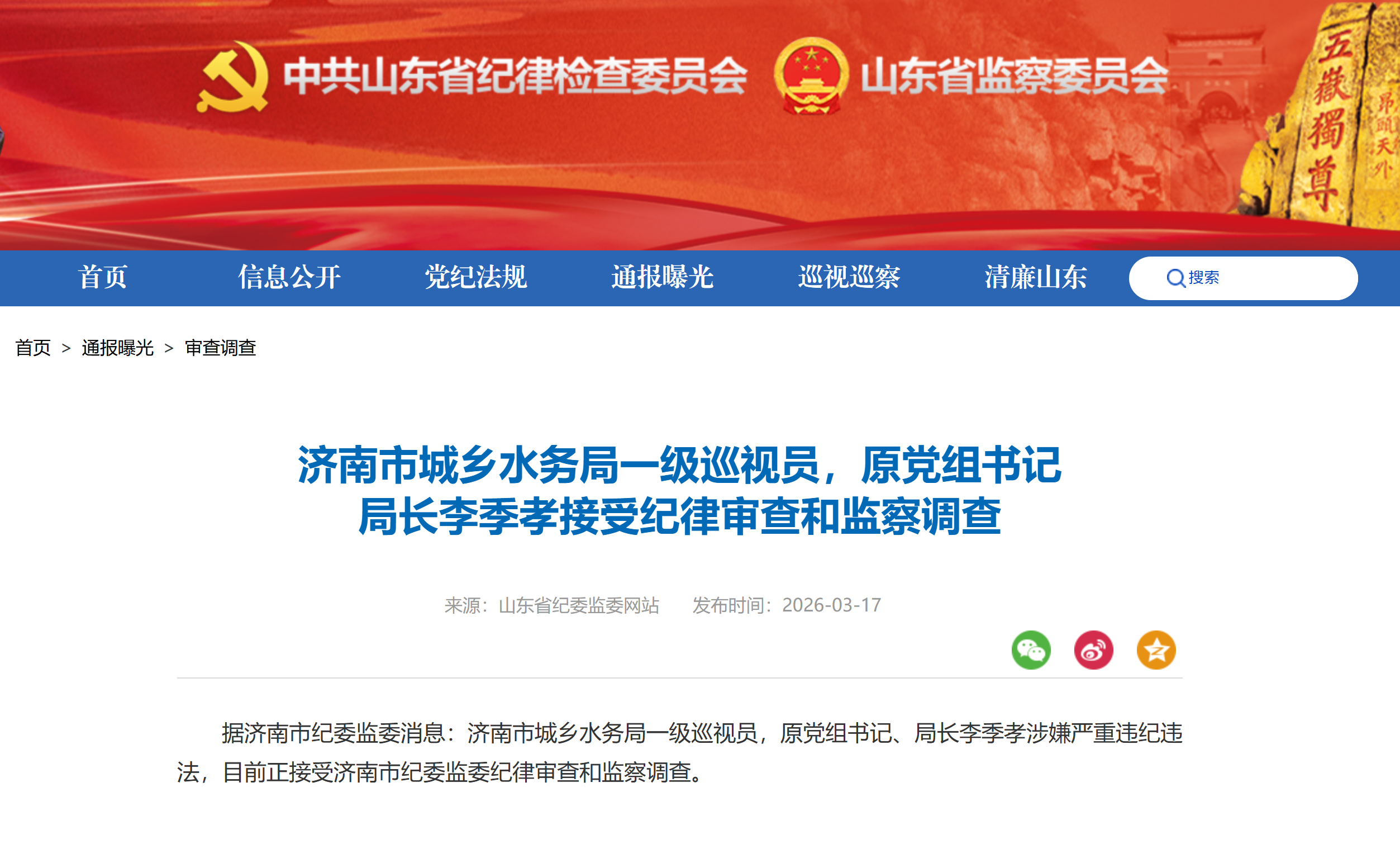 山东省纪委监委网站3月17日消息,济南市城乡水务局一级巡视员,原党组书记、局长李季孝涉嫌严重违纪违法,目前正接受济南市纪委监委纪律审查和监察调查。