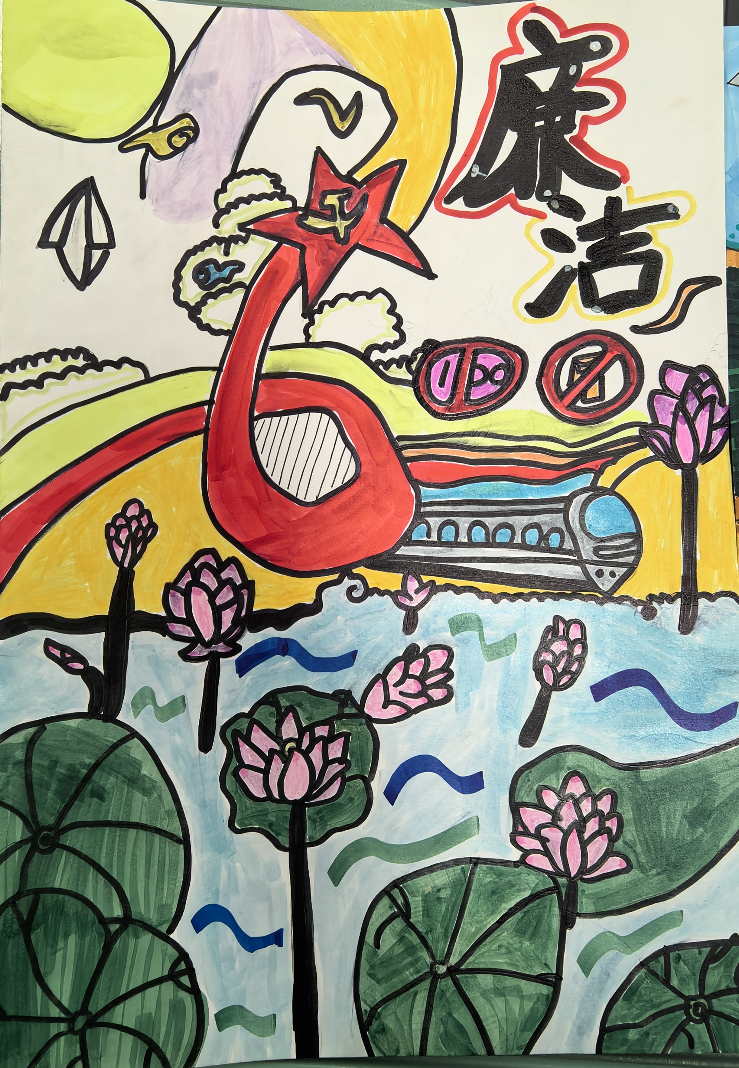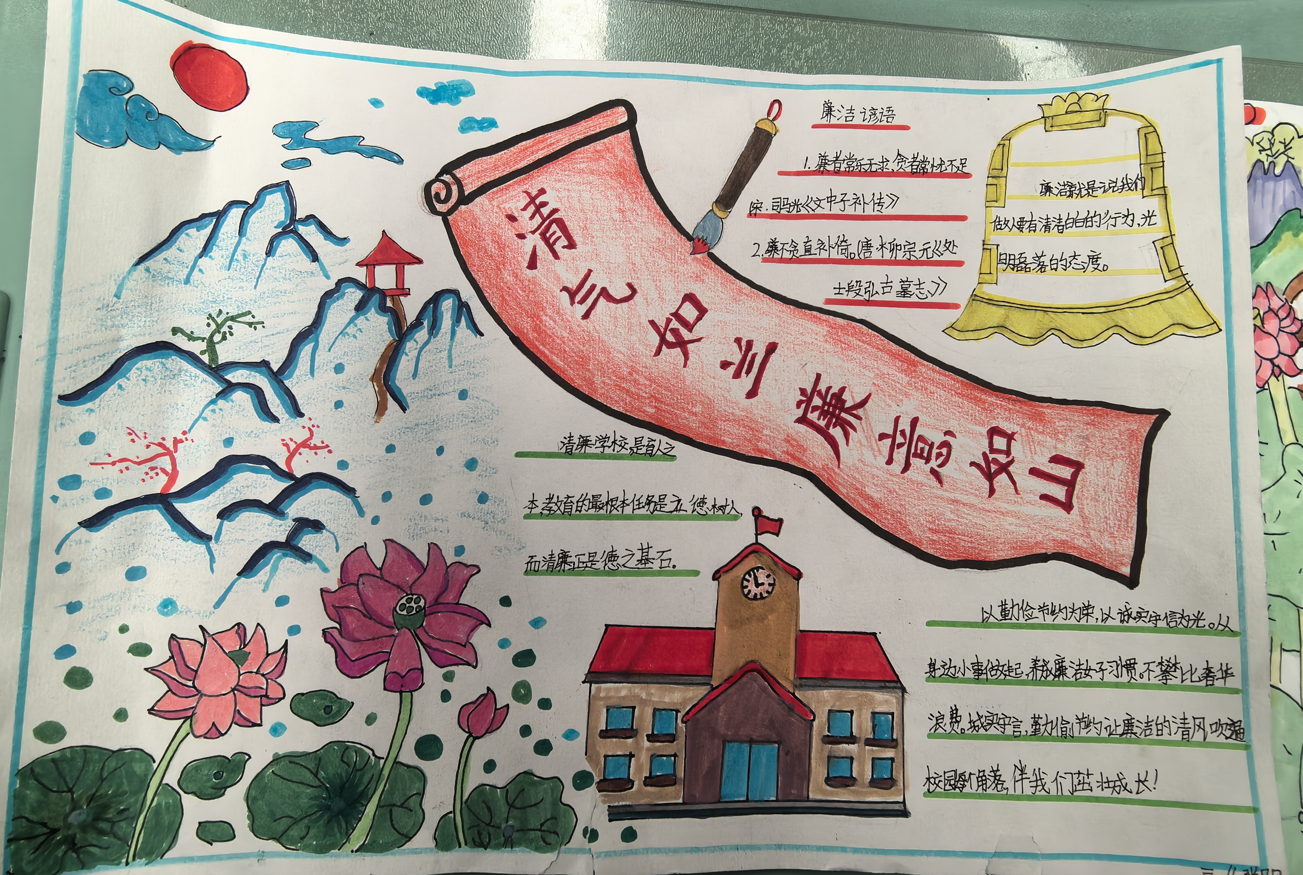 活动中,同学们的作品藏满巧思:以“出淤泥而不染”的荷花为核心意象,舒展的粉瓣与翠绿荷叶相映,生动诠释清正高洁的品格;挺拔的翠竹在画中节节向上,暗喻刚正不阿、坚守初心的操守;还有作品将书本、课堂等校园场景与“清廉”“崇廉尚德”等文字巧妙结合,让廉洁教育自然融入日常学习;更有山水、卷轴等传统意象,传递出“清气满乾坤”的廉洁意境。同学们手持作品自信展示,让廉洁文化以生动可感的形式浸润童心。