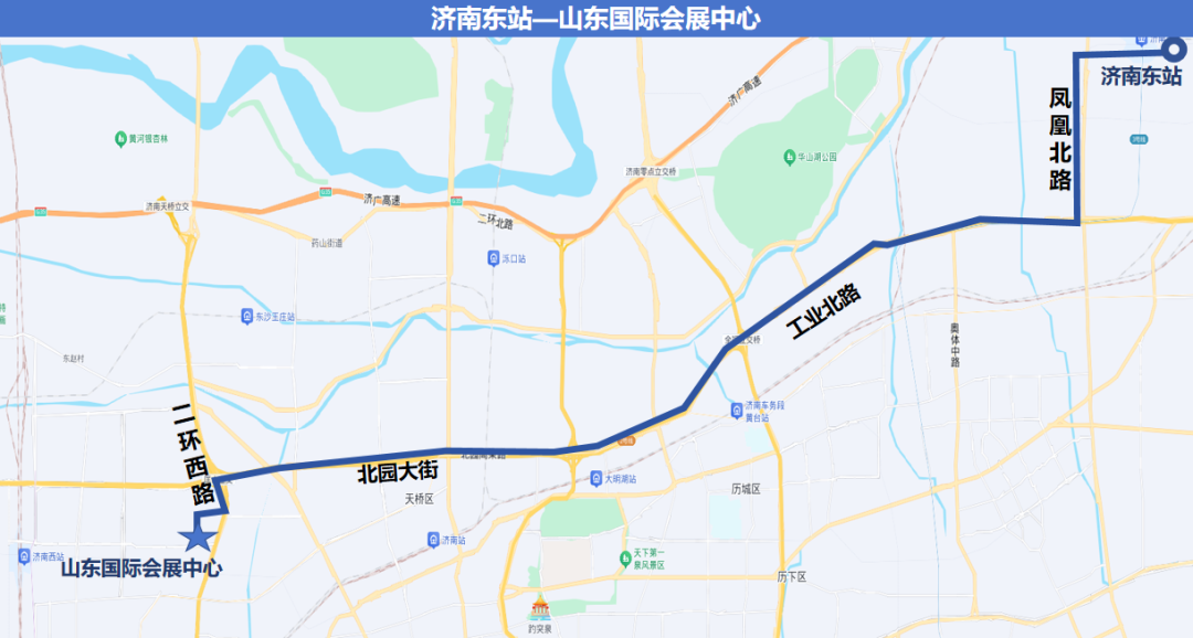 济南东站:乘车地点:济南东站公交西枢纽;发车时间:济南东站公交西枢纽:8:00-14:00,每小时整点、半点发车,根据客流适时加密。山东国际会展中心:13:00-17:00,每小时整点、半点发车,根据客流适时加密。
