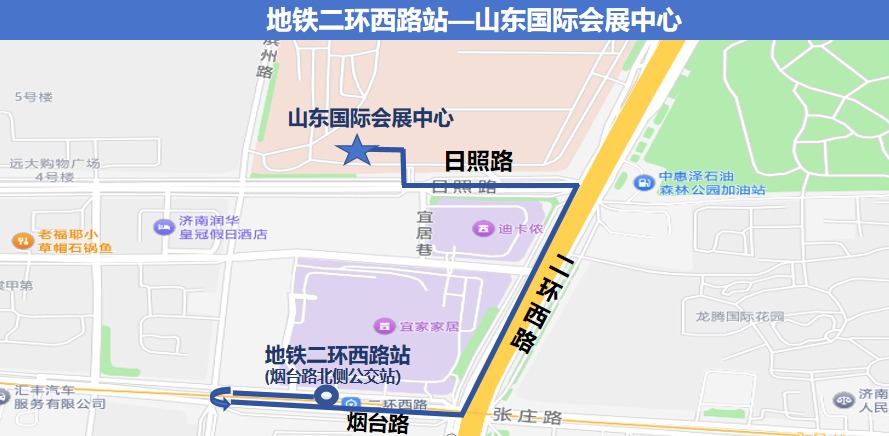 地铁接驳摆渡线乘车地点:地铁二环西路站(烟台路路北公交站)、山东国际会展中心5号馆西南侧