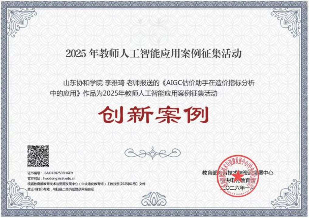 近日,教育部教育技术与资源发展中心(中央电化教育馆)公布2025年教师人工智能应用案例征集活动评选结果,山东协和学院李雅琦老师报送的《AIGC估价助手在造价指标分析中的应用》案例,凭借在人工智能与专业教学深度融合方面的创新探索,成功获评“创新案例”,展现了学校在教育数字化转型与智能教学应用领域的扎实成果。