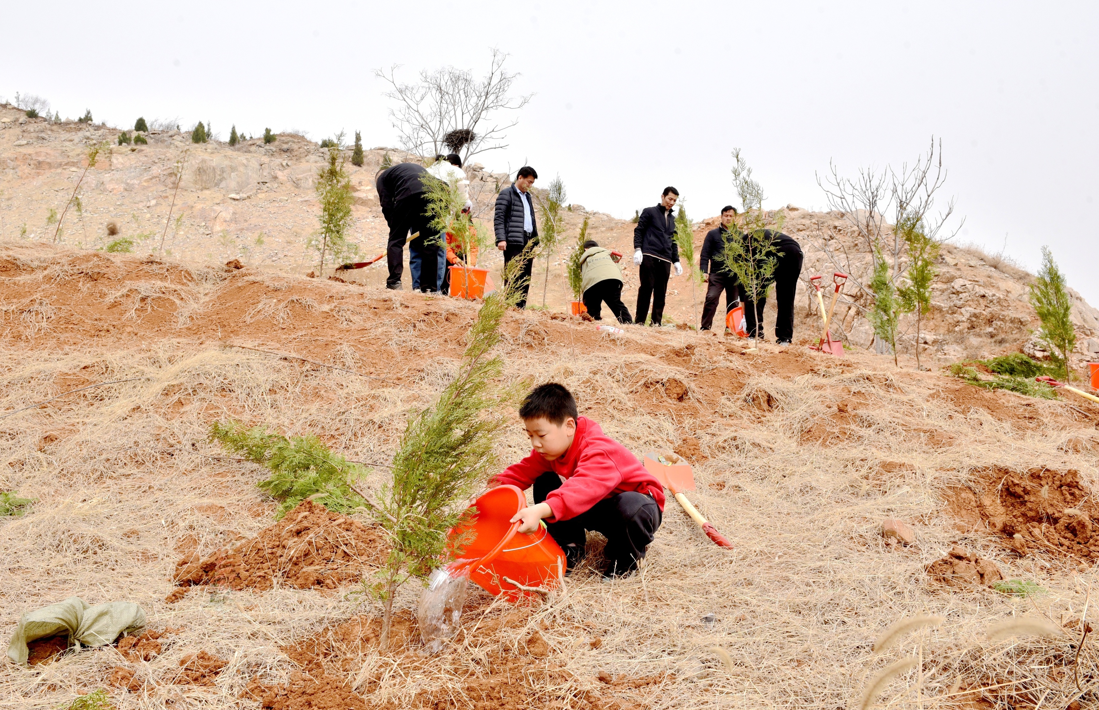 植树现场,一派热火朝天、干劲十足的景象。大家分工明确、配合默契,有的挥锹挖坑、有的扶苗培土、有的浇水灌溉,每一个环节都做得认真细致、有条不紊。挥锹时的专注、扶苗时的严谨、浇水时的用心,无不彰显着大家对生态保护的热情和对美好家园的向往。孩子们在家长的带领下积极参与,成为现场最亮眼的风景线。他们亲手挖坑、扶苗、培土、浇水,仔细完成每一个步骤,尽管手上沾满泥土、额头渗出汗水,但每个人的脸上都满是认真与期待,不仅体验了劳动的快乐,更在心中种下了“护绿爱绿”的种子。