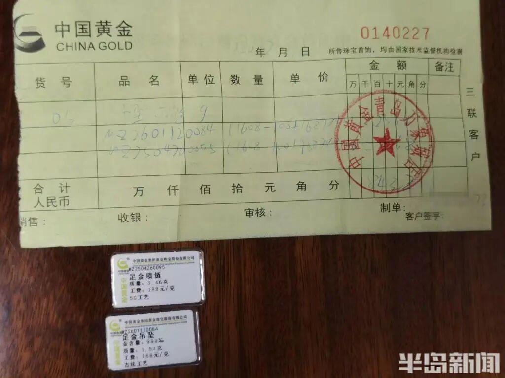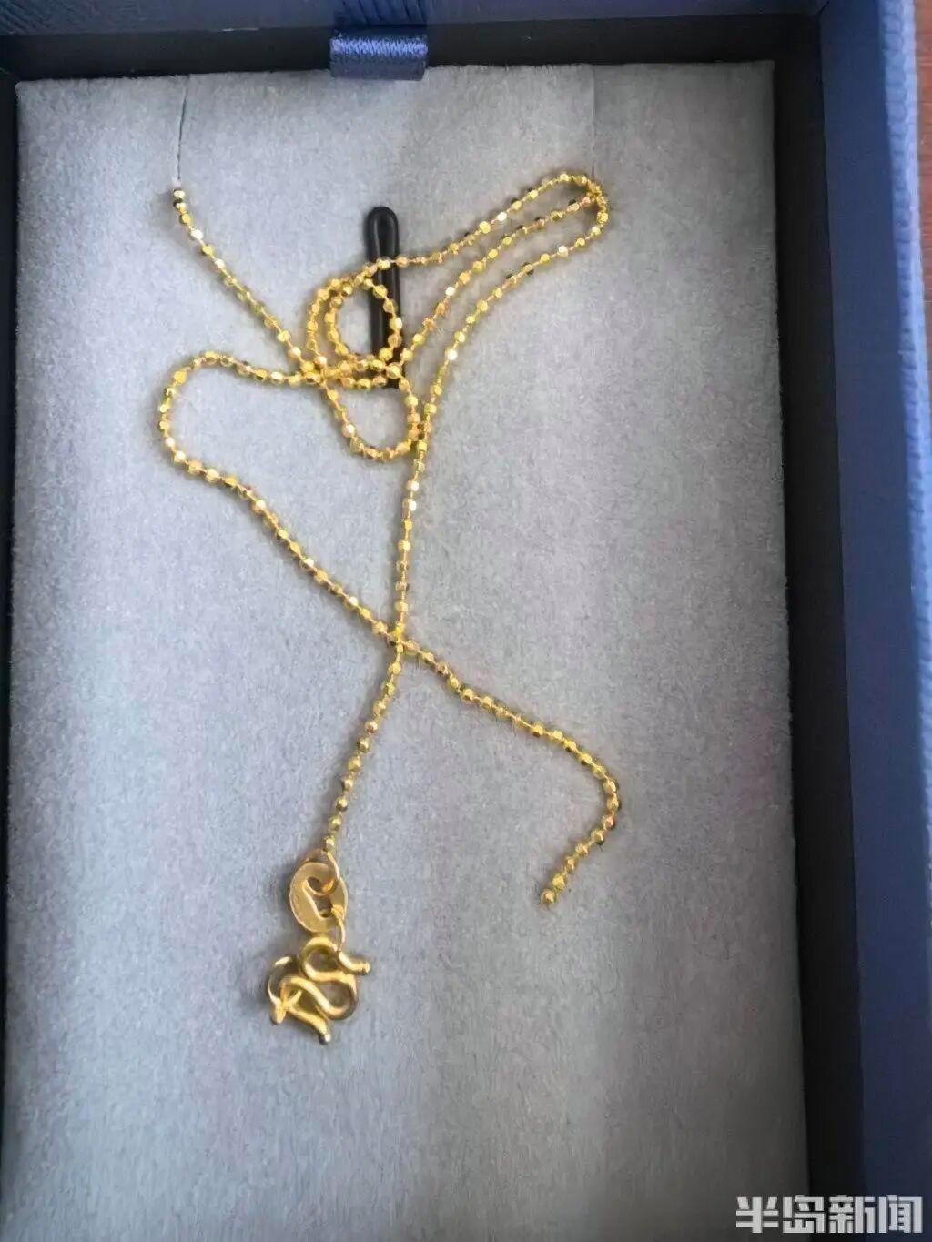 据江女士介绍,今年2月28日,她对象在中国黄金这家店购买了一条珠链样式的足金项链,质量为3.46克,加上每克188元的工费,项链共计花费5868元,另外还购买了一个价值2564元的足金吊坠,共花费了8432元。“当时买这个黄金首饰,主要想送给我作为‘三八’节礼物的。”江女士说,由于自己当时并不在青岛,购买以后,首饰带着原包装被放置起来。等到3月7日,其对象把首饰带到了济南,当面送给了江女士。等打开要佩戴时两人才发现,“项链不知道什么时候断裂成两截了”。