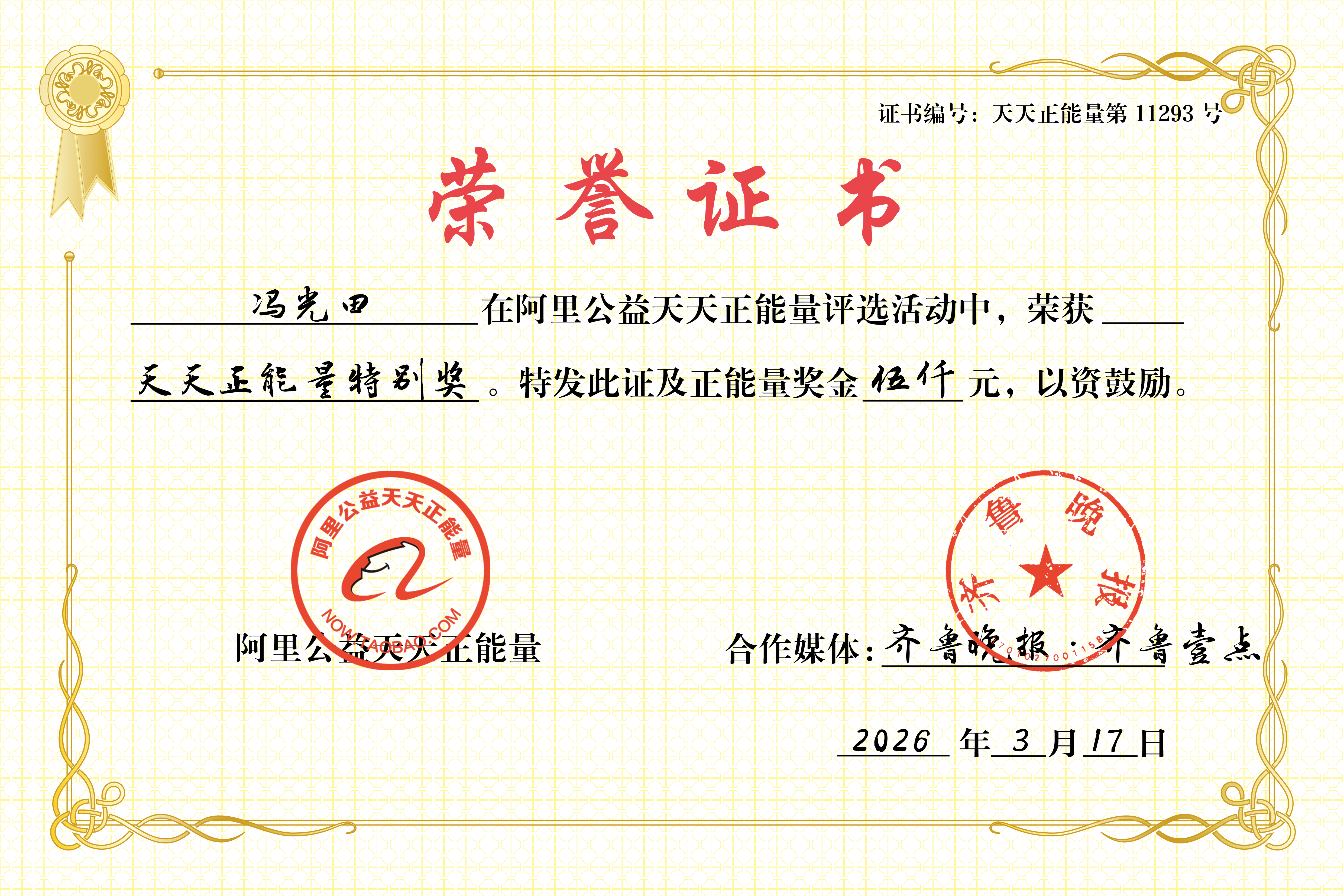 据了解,天天正能量是阿里公益联合齐鲁晚报·齐鲁壹点等全国多家主流媒体打造的公益项目,旨在奖励凡人善举,传递社会温暖。此次为冯光田颁奖,既是对其见义勇为行为的肯定,也希望带动更多人向善而行,让平凡善举温暖更多人。