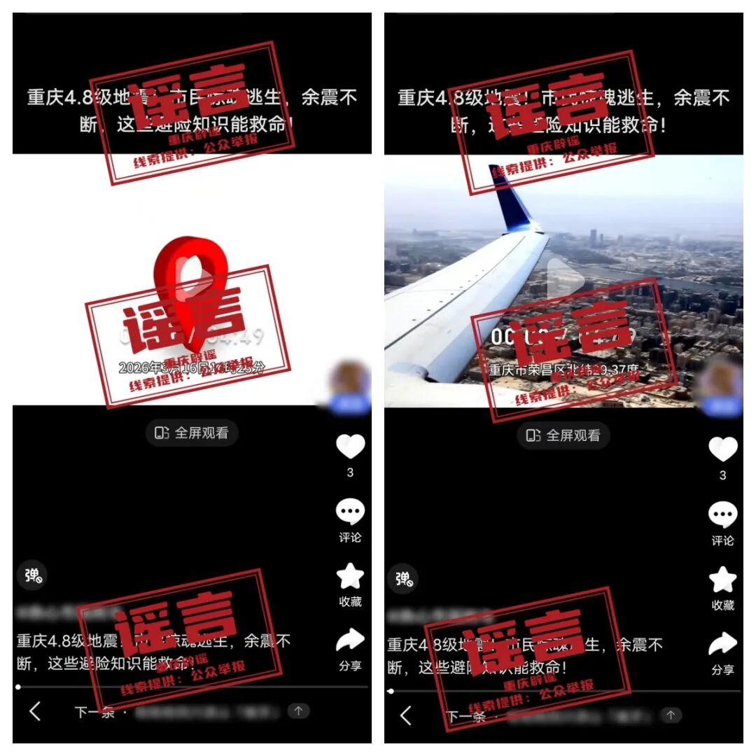 近日,有网民在互联网平台发布信息称“3月16日重庆荣昌区发生4.8级地震,市民惊魂逃生”,引发关注,经核实,网传信息系谣言。经向重庆市地震局及荣昌区相关部门核实,3月16日零时至24时,荣昌区未发生地震,网传信息系谣言。目前,警方正对造谣者展开调查。重庆辟谣提醒,网民在网络上发布信息,要真实、客观、准确。不造谣、不信谣、不传谣,共同营造清朗网络空间。