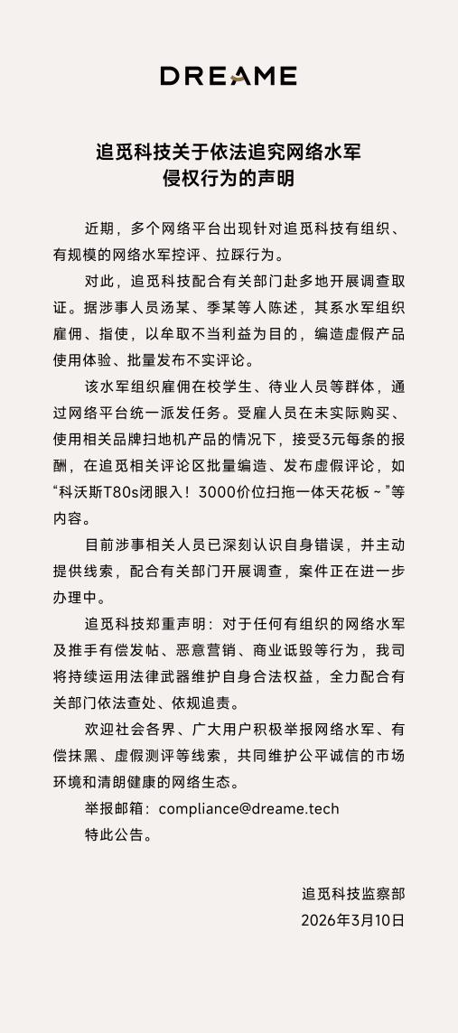 3月10日,追觅科技监察部发布声明,揭露遭有组织网络水军恶意拉踩并公布调查细节。像水军组织雇人未购产品,以3元一条报酬在评论区发虚假内容,如力荐科沃斯产品等。相关信息发布后,引发舆论热议。本文依托齐鲁蛙眼数智决策平台,选取上述两个扫地机器人行业头部品牌,从2026年1月1日至3月13日10时的全网声量数据展开竞对分析,梳理舆论关注点与公众期待,以期为今后相关行业高质量发展提供参考。