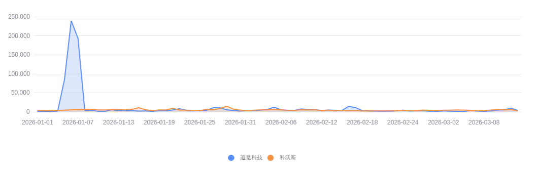 据齐鲁蛙眼数智决策平台,在分析时间段内,“追觅科技”方案全网信息总量为782361条,“科沃斯”方案全网信息总量为330546条。从综合传播变化趋势来看,“追觅科技”方案传播热度在2026年1月6日达到了峰值238998条,“科沃斯”方案传播热度在2026年1月29日达到了峰值14737条。