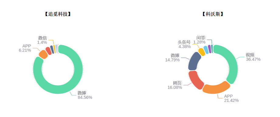 在分析时间段内,“追觅科技”方案的主要传播平台集中在微博661592条(占比84.56%);“科沃斯”方案的主要传播平台集中在视频120547条(占比 36.47%)。