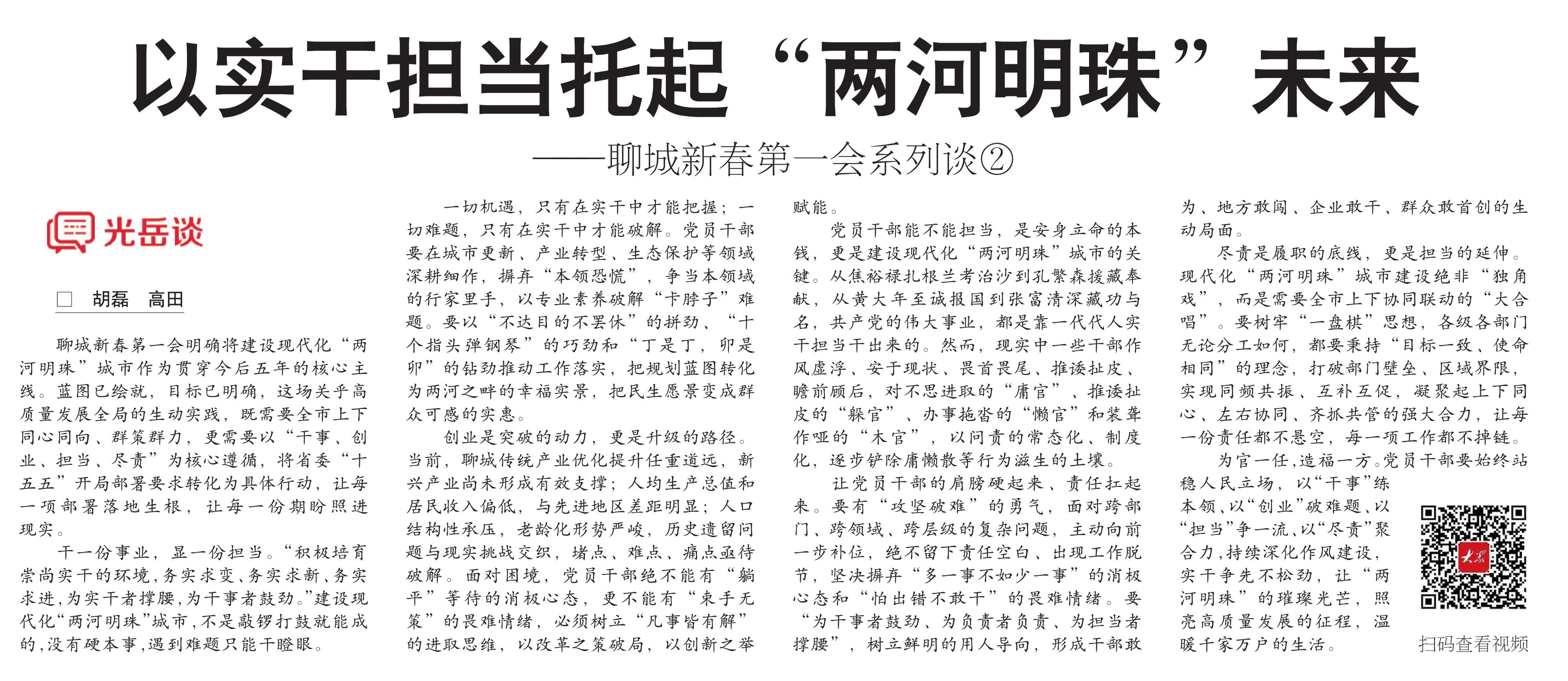 一座城、一条心、一起干。加快建设现代化“两河明珠”城市,是时代之问的聊城作答,是跨越赶超的行动路径,更是万家灯火的温暖守望。站在“十五五”开局的新起点,全市上下锚定总牵引不偏向、实干争先不止步,以干事创业的韧劲、担当尽责的自觉,把城市建设得更宜居、更人文、更有活力,让黄河与大运河相拥的这片土地,绽放出更加璀璨的“明珠”之光。
