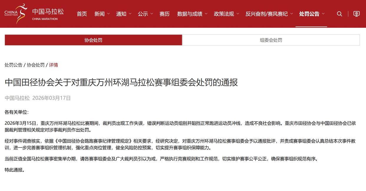 3月17日,中国马拉松官方网站发布《中国田径协会关于对重庆万州环湖马拉松赛事组委会处罚的通报》: