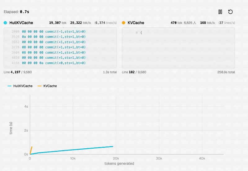 借助凸包数据结构,模型可以在生成Token的过程中,动态维护历史Key的凸包,每一步的注意力查询只需在凸包上进行。
