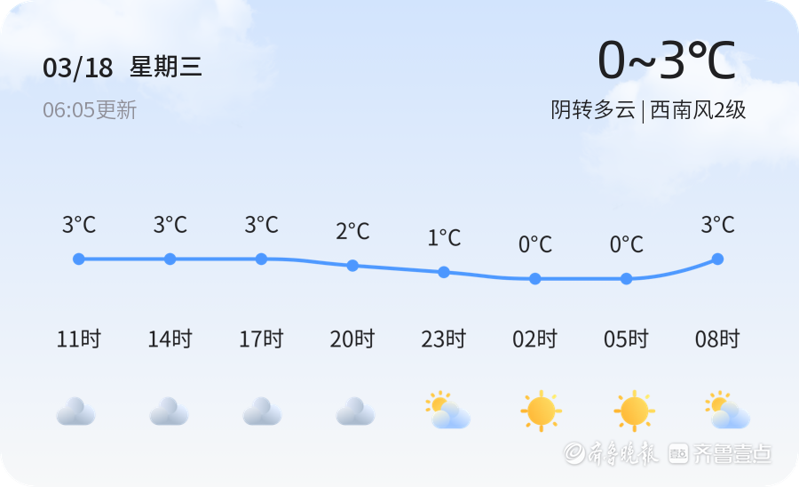 今天是3月18日,正月三十,威海市迎来阴转多云的天气。今日气温较低,最高气温3℃,最低气温0℃,西南风2级,空气湿度50%,PM2.5指数为100。各区天气情况基本一致,均为阴转多云,风力较小,整体天气较为阴冷。