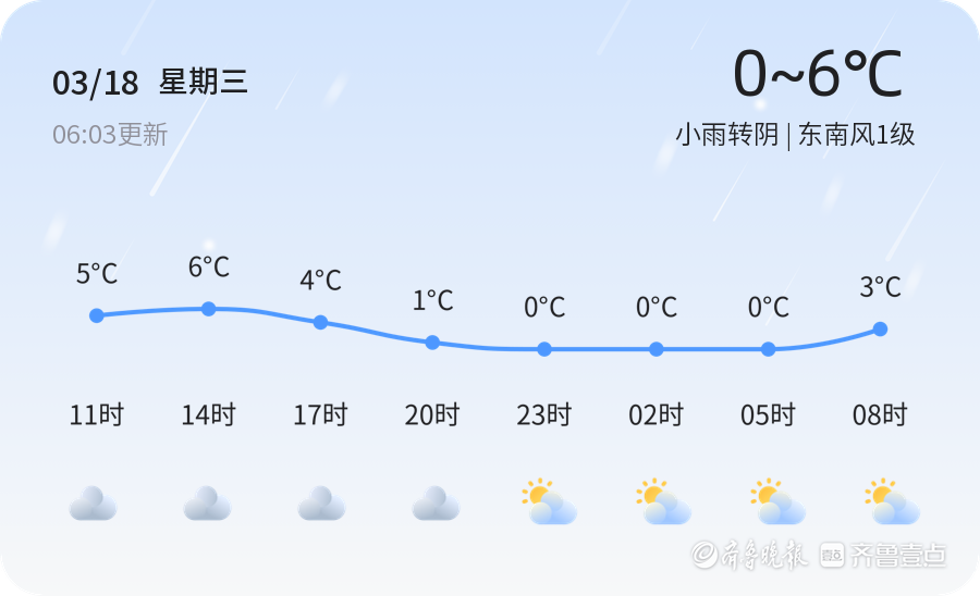 今天是3月18日,星期三,农历正月三十。潍坊市今日天气为小雨转阴,气温范围在0℃至6℃之间,东南风1级,空气湿度为72%。PM2.5指数为52,空气质量等级为良,适合户外活动。市民今日出行请注意携带雨具,谨防道路湿滑,行车时保持安全距离,确保出行安全。