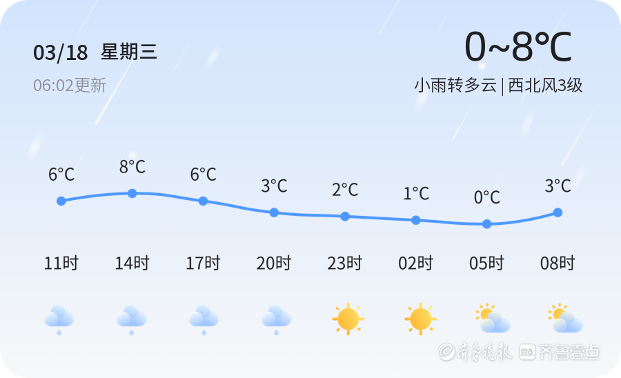 今日是3月18日,正月三十,东营市迎来小雨转多云的天气。白天气温在0℃至8℃之间,西北风3级,空气湿度88%,空气质量良好(PM2.5指数82)。降雨天气可能导致路面湿滑,建议市民出行携带雨具,注意交通安全。