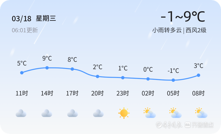 今天是3月18日,星期三,农历正月三十。淄博市今日天气为小雨转多云,温度范围在-1℃至9℃之间。当前风向为西风,风力2级,空气湿度75%。PM2.5浓度为137,空气质量为轻度污染,建议敏感人群减少外出,普通市民外出时佩戴口罩,做好防护措施。由于今天早晨气温较低,路面可能湿滑,市民出行时请注意交通安全,减速慢行。今天的降水过程主要集中在早晨和上午,下午逐渐转为多云,市民可合理安排出行时间。
