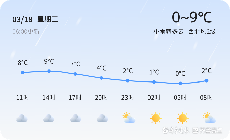 今天是3月18日,星期三,农历正月三十。青岛市今日天气为小雨转多云,温度范围在0℃至9℃之间,目前气温为5.5℃。风向为西北风,风力2级,空气湿度为84%,PM2.5浓度为54,空气质量等级为良。市民外出时请注意携带雨具,同时由于早晚温差较大,建议适当增添衣物,谨防感冒。空气质量良好,适合户外活动,但需注意保暖,尤其是早出晚归的市民。出行时请关注天气变化,合理安排行程。