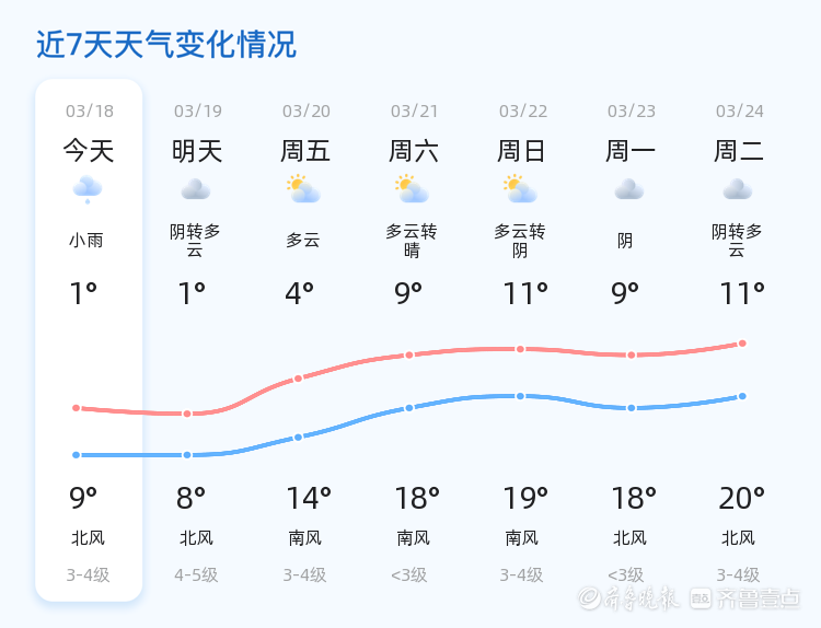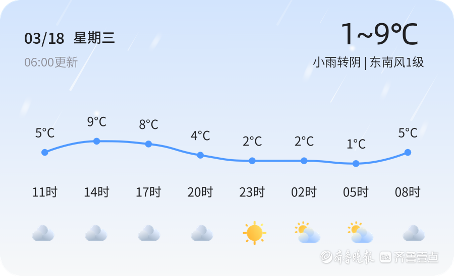 今天是3月18日,星期三,农历正月三十。济南市迎来小雨转阴的天气,气温在1℃到9℃之间,东南风1级,空气湿度为85%,PM2.5指数为125。目前,济南市各区的天气情况基本一致,均为小雨转阴,气温较低,市民出行需携带雨具并注意保暖。