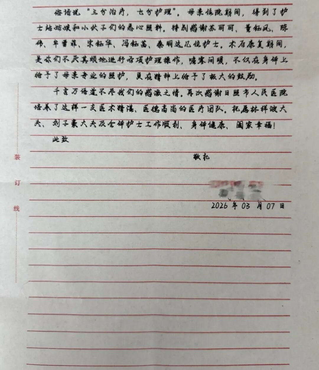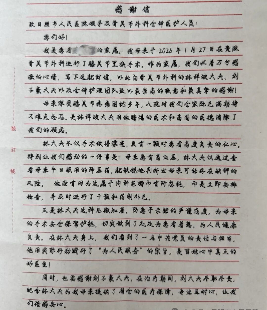 一纸信笺寄真情,医者仁心暖人心。近日,日照市人民医院关节外科收到了患者李女士家属专程送来的一封感谢信。信件没有华丽的辞藻,却用朴实真挚的文字,记录下住院治疗期间的点点滴滴,字里行间满是对科室医护人员精湛医术、优质服务的由衷感谢,定格了医患之间信任与温暖的动人瞬间。