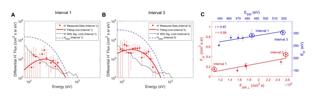 最近来自中国科学院国家空间科学中心科研团队与国内外单位合作,将NILS获取的H⁻能谱与ARTEMIS卫星同期观测的上游太阳风参数进行了系统分析。结果显示,H⁻积分通量与太阳风法向通量之间存在强正相关(r=0.87),H⁻平均能量与太阳风能量同样呈强正相关(r=0.88)。这些结果为其起源于太阳风与月表相互作用提供了直接观测证据。此外,H⁻平均能量集中在250–300 eV,说明这些负离子主要由太阳风在月表的散射过程产生。