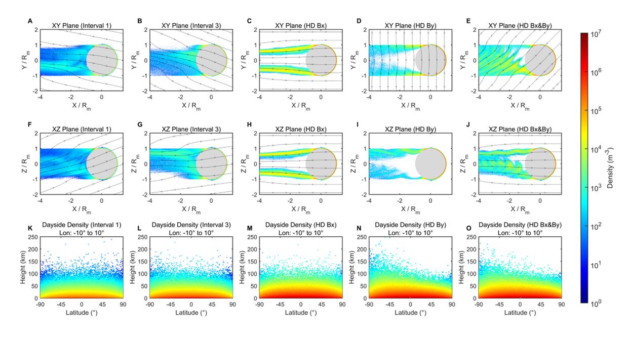 为评估H⁻对月球空间环境的影响,本研究进一步模拟揭示了其空间分布特征。在向阳面,由于光致解吸效应,H⁻被限制在紧贴月球表面的薄层内,密度随高度迅速衰减。在背阳面,由于该区域处于月球阴影区内无太阳光照,光致解吸效应消失,H⁻被电磁场拾起后可形成延伸数个月球半径的长负离子尾。这一新发现的带电粒子组分可参与填充月球尾迹区的等离子体空腔。在极端太阳风密度事件期间,H⁻密度可比正常条件高出10倍以上,其可能对月球空间环境带来显著影响,比如产生一些等离子体波动等。