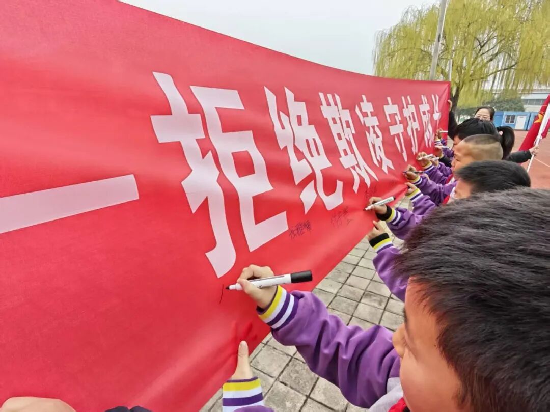 学生们在“拒绝欺凌 守护成长”主题条幅上郑重签字承诺,以实际行动表达对校园欺凌说“不”的坚定决心。红领巾执勤岗遍布校园各个角落,及时劝解记录不文明行为,用责任与担当守护校园文明,共同营造安全、友善、和谐的校园环境,让每一位同学都能在阳光下健康快乐成长。