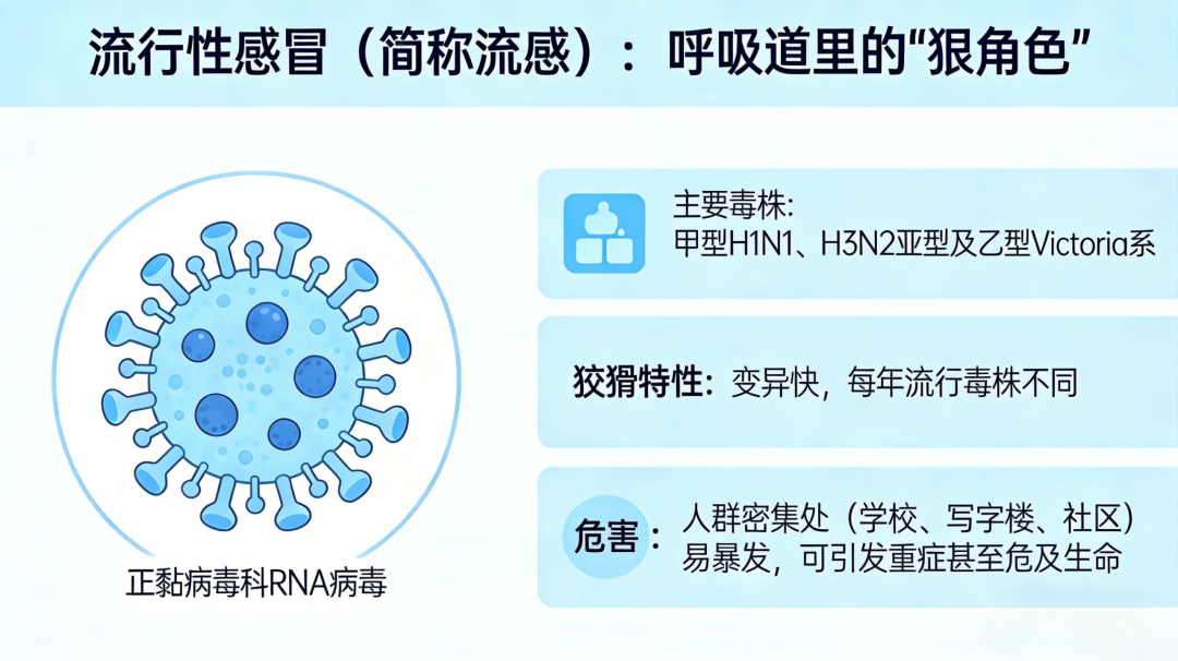 流行性感冒(简称流感):那可是呼吸道里的“狠角色”,由专门的流感病毒(主要是甲型H1N1、H3N2亚型及乙型Victoria系,也就是我们常说的甲流、乙流)引起,属于正黏病毒科RNA病毒。它最狡猾的地方就是变异快,每年流行的毒株都可能不一样,致病性更是远超普通感冒病毒。一旦出现,很容易在学校、写字楼、社区这些人群密集的地方“扎堆暴发”,严重时还可能引发重症甚至危及生命。