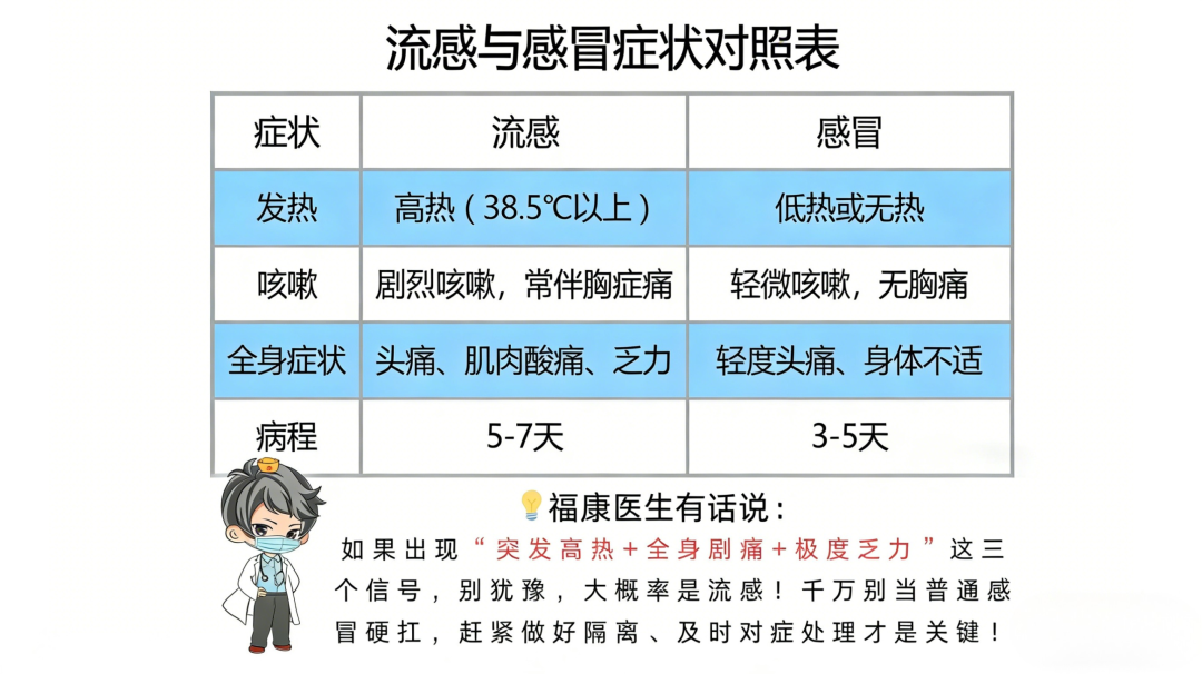 很多人分不清流感和感冒,核心就是没抓住关键——普通感冒是“局部闹别扭”,流感是“全身受暴击”。结合上面提到的致病菌差异,下面这张对照表格,汇总了临床常见症状,帮大家10秒快速区分,建议收藏起来,不舒服时直接对照判断!