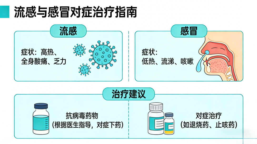 普通感冒:无需特意服用抗病毒药,重点是休息和对症缓解——多喝温水、保证睡眠。
